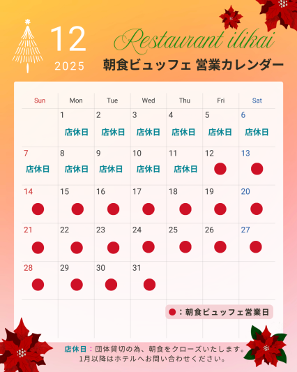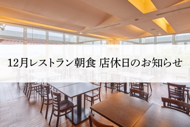 誠に勝手ながら、2025年12月レストラン朝食を団体貸切の為、下記日程をお休みさせていただきます。 お客様には大変ご迷惑をおかけいたしますが、ご理解とご協力をお願い申し上げます。