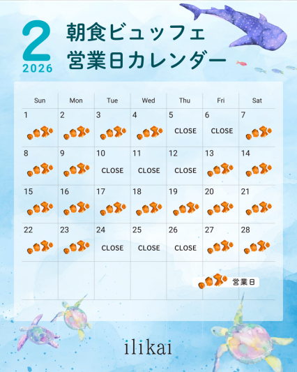 誠に勝手ながら、2026年2月レストラン朝食は団体貸切の為、下記日程をお休みさせていただきます。 お客様には大変ご迷惑をおかけいたしますが、ご理解とご協力をお願い申し上げます。