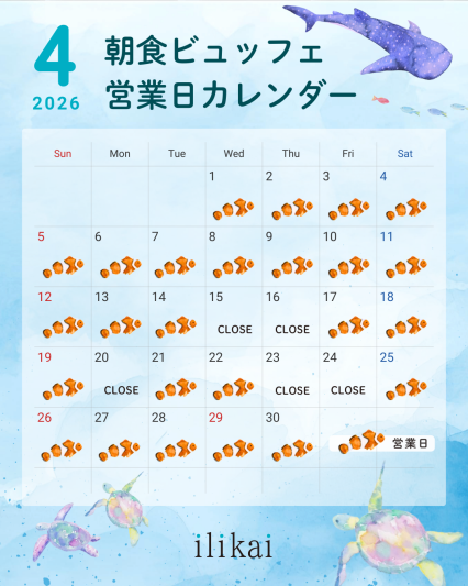 誠に勝手ながら、2026年4月レストラン朝食は団体貸切の為、下記日程をお休みさせていただきます。 お客様には大変ご迷惑をおかけいたしますが、ご理解とご協力をお願い申し上げます。